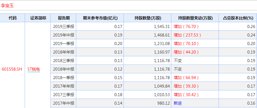 另外,目前位列ST锐电第五大流通股东的李宝玉从2017年第三季度至2019年三季度的9个季度,有5个季度增仓ST锐电,其个人持股变化从2017年中报新进时的980万股一路增加至2019年11月份的1569万股,其中2019年李宝玉连续增仓最为明显。