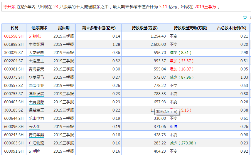 但在2010年之后徐开东持股路线切入“低价股+重组”赛道。以2019年三季度末持股为例,徐开东进入23家A股公司前十大股东,其中仅ST股就有4只。徐开东是在2017年年报时进入ST锐电前十大股东,持股1254万股,截止2019年11月15日其持股一直未变。