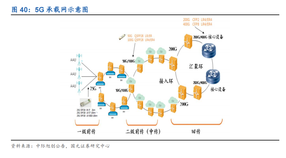 另外,光模块在通信领域和数通领域应用以及价格区别较大。在通信领域,4G时期光模块速率以10G为主,5G高带宽需求需引入高速光口,前传以25G光模块为主;中传或以50G为主;5G回传或将使用100G/200G/400G产品。总体来说,5G基站建设对光模块的需求主要集中于需要速率较小的前传部分,而5G网络的中传、回传所需光模块较前传少。数通市场方面,每年快速增长的流量及数据交换效率提升的要求已驱动数据中心普遍使用100G光模块,并在2020年开始使用200G和400G光模块。