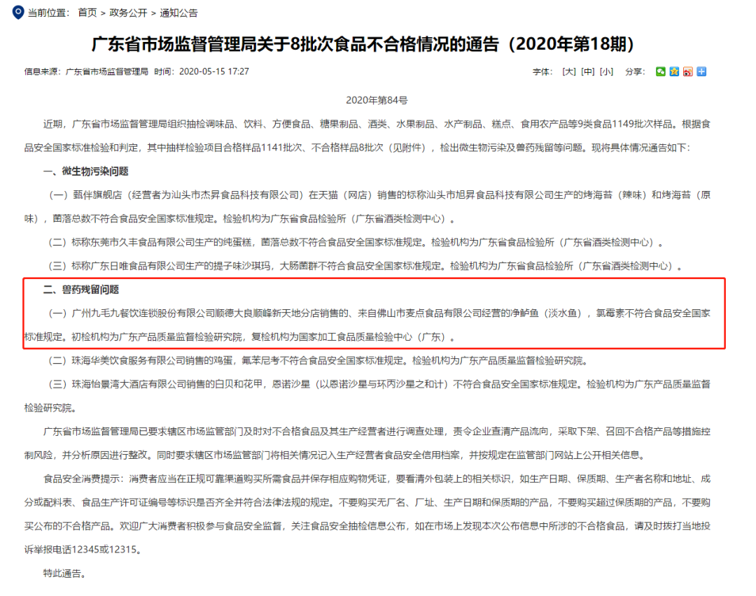 其中,广州九毛九顺德大良顺峰新天地分店销售的、来自佛山市麦点食品有限公司经营的净鲈鱼(淡水鱼),氯霉素不符合食品安全国家标准规定。初检机构为广东产品质量监督检验研究院,复检机构为国家加工食品质量检验中心(广东)。