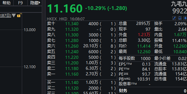 但创下新高后,九毛九就掉头向下。继昨日收跌2.81%后,九毛九5月22日继续大跌10.29%报11.16港元,最新总市值154亿港元。