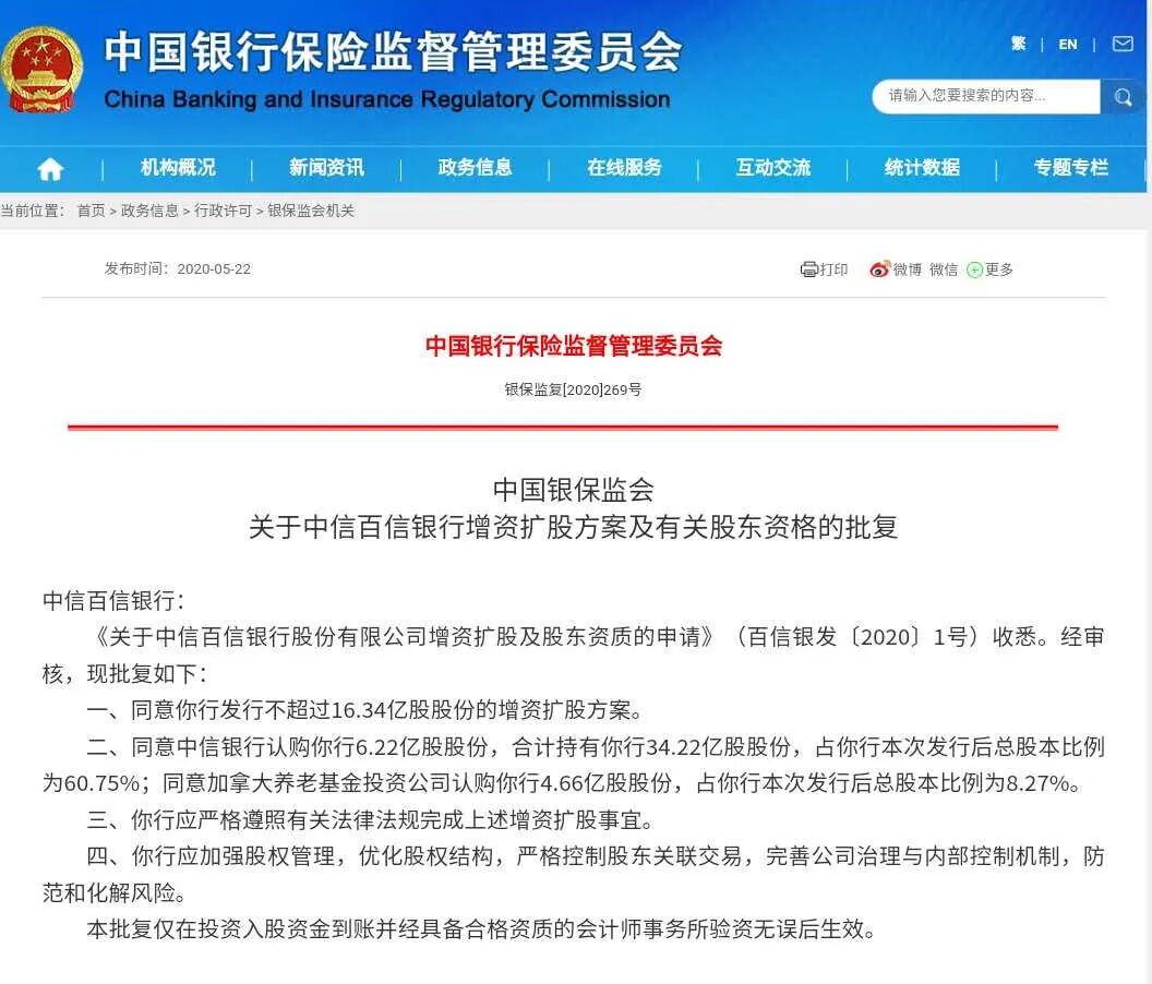 此番银保监会的批复内容也披露了部分具体的增资安排:中信银行获批认购百信银行6.22亿股,合计持有该行34.22亿股;加拿大养老基金获批认购该行4.66亿股股份。