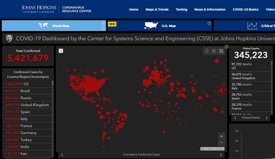 根据约翰·霍普金斯大学实时数据显示,截至北京时间5月25日18时,目前全球新冠肺炎累计确诊542.17万例,累计死亡34.5万例。