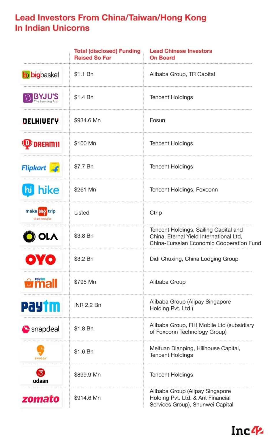 事实上,印度独角兽企业当中,绝大部分有中国资本的身影,如阿里、腾讯、美团等都有在列。