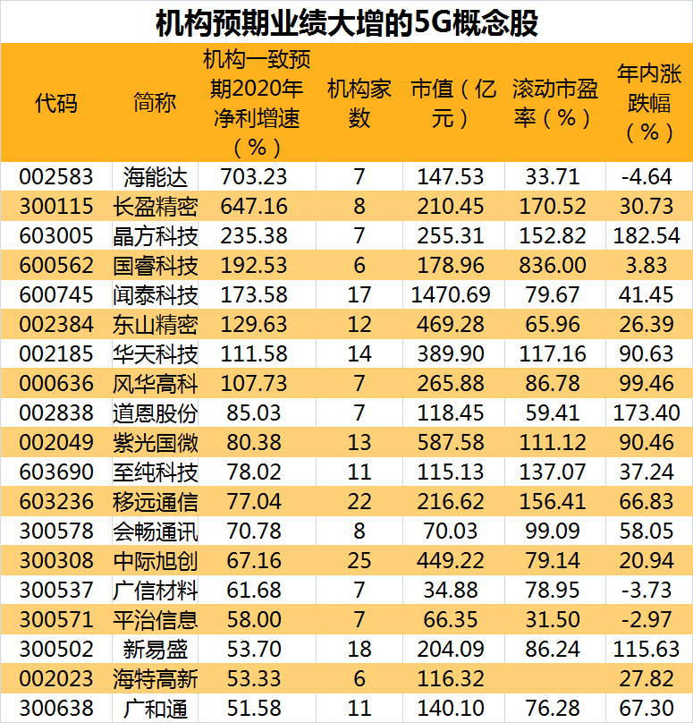 证券时报·数据宝不完全统计显示,5G概念股流通市值合计有3万亿元人民币,根据5家机构以上预测的2020年净利润增速看,共有19家5G概念股增速在50%以上。