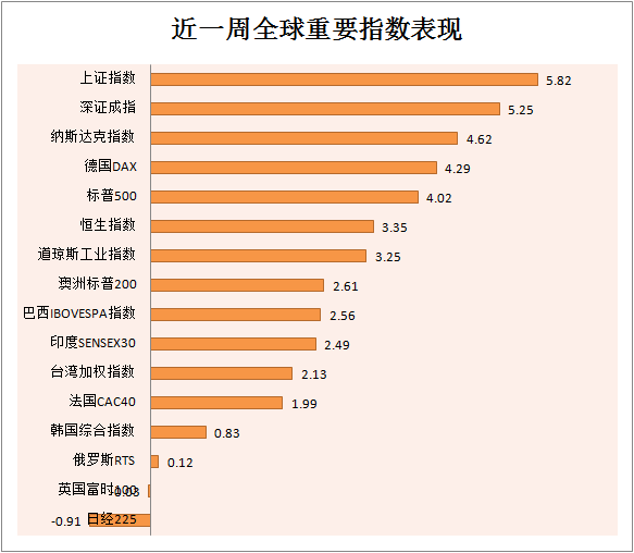 从近一周来看,上证指数和深证成指领涨全球,周度涨幅分别为5.82%和5.25%。美国股市中的纳斯达克指数本周实现4连涨,最新收盘价再次刷新历史记录,周涨幅仅低于上证指数和深证成指。全球重要指数中,仅有日经225指数出现下跌。