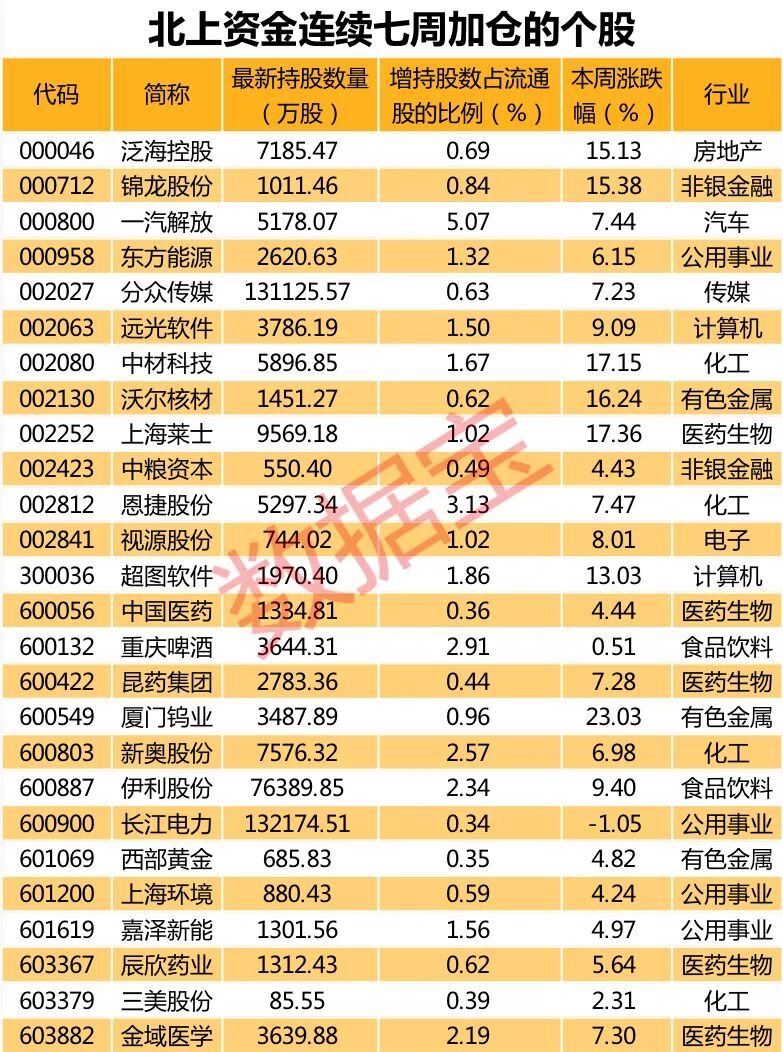 将时间拉长,26股被北上资金连续七周加仓。从持股比例变动情况来看,一汽解放获加仓幅度最大,相比七周前持股比例增加了5.07个百分点;其他加仓较多的还有恩捷股份、重庆啤酒、新奥股份、伊利股份等。