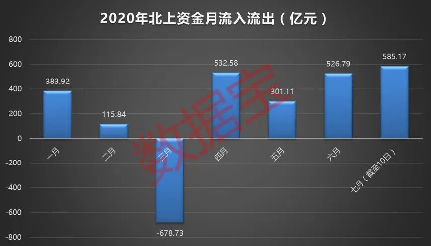 截至发稿,7月北上资金已累计净买入585.17亿元,刷新今年以来的月买入纪录。值得注意的是,在A股涨幅巨大情况下,北上资金在本周五出现了7月以来第一次日流出,当日也是本月沪指的第一次下跌。