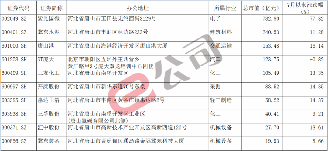 值得一提的是,随着7月以来的A股放量大涨,上述不少上市公司股价累计涨幅不小,其中,涨幅最大的当属紫光国微,区间涨幅达77.32%。截止上周五收盘,总市值超782亿元。其次为汇中股份,涨幅为18.6%;唐山港,涨幅为16.14%;惠达卫浴,涨幅为14.36%;开滦股份,涨幅为14.35%;三友化工,涨幅为13.35%;冀东水泥,涨幅为11.28%。