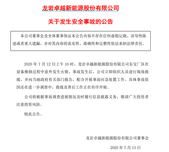 7月12日下午,卓越新能发布公告称,2020年7月12日上午10时,公司东宝厂区在设备维修过程中意外发生火情。事故发生后,公司立即组织人员进行现场救援,并向当地政府有关部门报告,配合开展事故应急处置工作。具体事故原因还在进一步调查中,救援及善后工作正在有序开展。