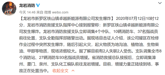 跟据福建龙岩消防通报,截至14时,事故目前造成2人失联2人受伤。目前龙岩市消防支队调集全市8个消防站、27辆消防车93名指战员增援。省消防救援总队接报后,立即调集漳州、厦门、泉州、支队化工编队前往龙岩增援。