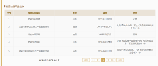 实际上,卓越新能曾多次因安全隐患被责令整改。国家企业信用信息公示系统(福建)显示,2016年8月,卓越新能在龙岩市新罗区安全生产监督管理局的抽查中被发现14条安全隐患,被下达《责令限期整改指令书》。2016年11月,被发现2条安全隐患,再次被下达《责令限期整改指令书》。2018年8月,卓越新能因未按《监控化学品管理条例》规定报备信息,龙岩市经信委下达整改通知书。