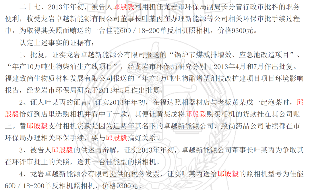除上述处罚外,中国裁判文书网显示,2013年年初,被告人邱殷毅利用担任龙岩市环保局副局长分管行政审批科的职务便利,收受龙岩卓越新能源有限公司董事长叶某丙在办理新能源等公司相关环保审批手续过程中,为取得其关照而贿送的一台佳能60D/18-200单反相机照相机,价格9300元。