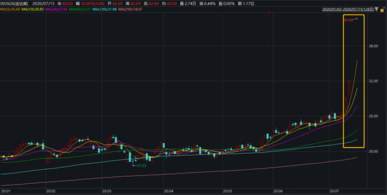 二级市场上,金达威股票7月9日-7月15日期间已连续五个交易日涨停,目前报收42.69元/股,总市值263亿元。