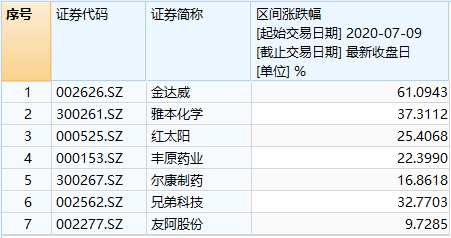 证券时报记者梳理发现,自7月9日至7月15日五个交易日,除金达威五个涨停股价大涨61.09%外,其它NMN概念股也表现不俗,其中雅本科技上涨37.31%、兄弟科技上涨32.77%。