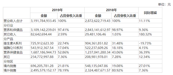 资料显示,金达威主要从事食品营养强化剂行业原料和保健食品终端产品的生产、销售业务,2019年实现营业收入31.92亿元,同比增长11.11%;净利润4.51亿元,同比减少34.42%。2020年一季度,公司实现营业收入8亿元,同比增长19.14%;净利润2.17亿元,同比增长65.48%。证券时报记者查阅金达威2019年年报发现,公司的主要产品是维生素A系列、辅酶Q10系列和营养保健食品,占营收比重分别为22.74%、17.04%、52.86%。而根据公司称“NMN产品占公司的销售比例很低”猜测,NMN产品应归属于“其它”类,该类总占比不足7.36%。记者发现,公司在年报中并未单独提及NMN产品,只是强调了“年产800吨维生素A油和年产200吨维生素D3油”项目预计将于2021年上半年进入试生产阶段。