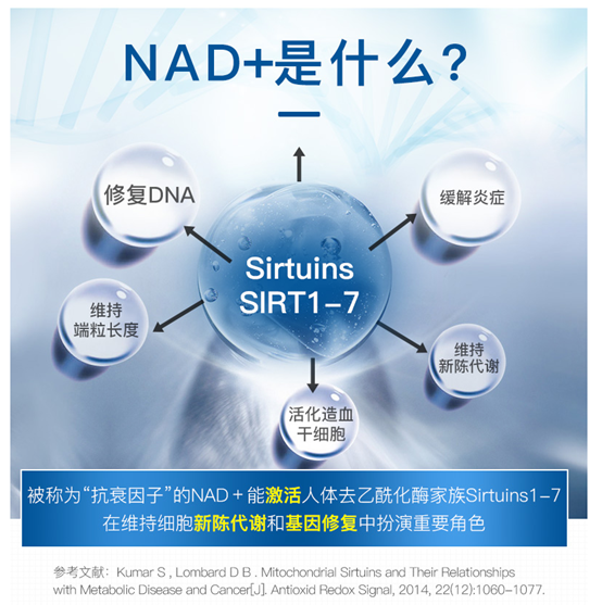 据悉,NMN全称为β-烟酰胺单核苷酸,是人体中合成NAD+(辅酶I)的前体,其功能通过NAD+体现,NAD+在细胞中是几百种重要代谢酶的辅酶,并作为信号分子参与许多重要细胞过程。国际最权威的学术杂志 Science、Nature、Cell 上的研究成果都证明补充NMN 可有效地增加和恢复体内 NAD+水平,大幅延缓衰老和防止老年痴呆症等多种神经元退化疾病,并由此从根本上调理和改善衰老的各种症状。