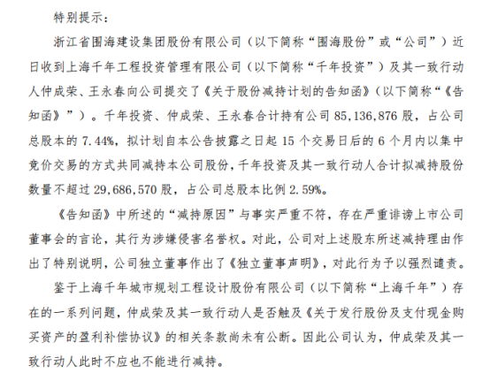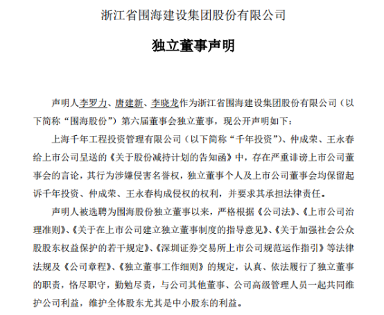 *ST围海第六届董事会独立董事李罗力、唐建新、李晓龙公开声明,千年投资、仲成荣、王永春给上市公司呈送的《关于股份减持计划的告知函》中,存在严重诽谤上市公司董事会的言论,其行为涉嫌侵害名誉权,独立董事个人及上市公司董事会均保留起诉千年投资、仲成荣、王永春构成侵权的权利,并要求其承担法律责任。